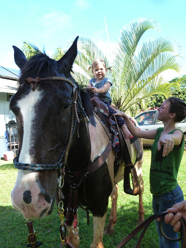 The girls like the horses around here, just a bit. : ) Actually we have horse pastures everywhere we look around the North Shore and often have riders trot by the house so the kids can wave from our fence. These were taken at our friend's house in Pupukea. Thanks Nakelli!